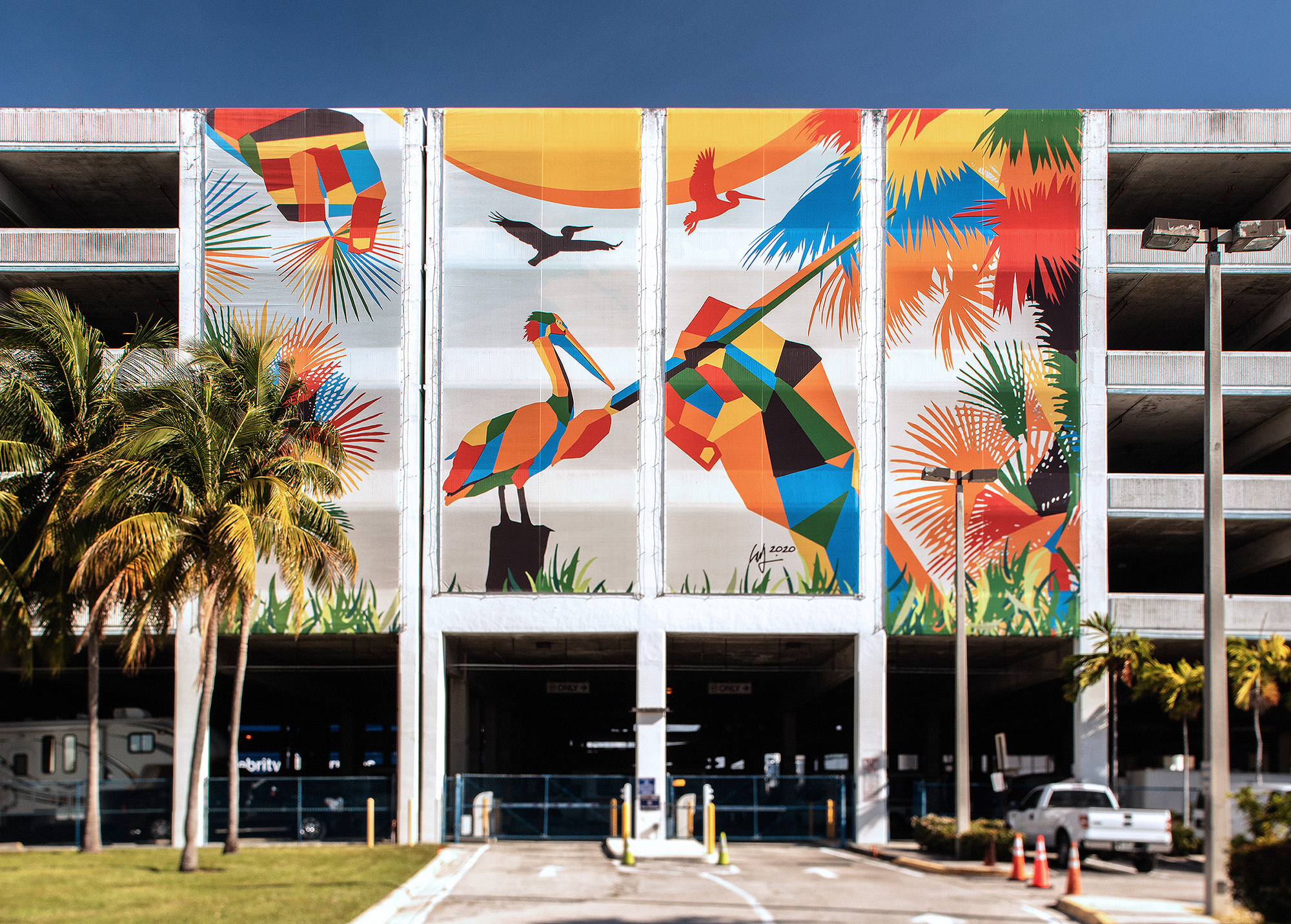 For my this installation I wanted to highlight and acknowledge the native environment of Port Everglades. My approach was to create a series of geometric illustrations that reflect the flora and fauna as well as the wildlife of the everglades in a bright, bold, inventive and playful manner. Abstracted hands are added to the composition, engaged in crafting the scene as if it were a stage set. This contributes an element of poetic whimsy to the image and suggests that much of our lives and the pleasure we derive are the result of carefully curating our experiences.